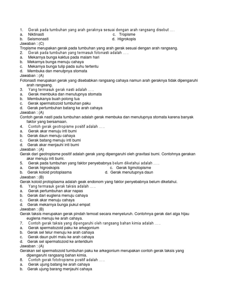 Umumnya terjadi pada tumbuhan tingkat rendah. Taksis adalah gerak seluruh tubuh atau bagian dari tubuh tumbuhan yang berpindah tempat dan arah perpindahannya dipengaruhi rangsangan. 2 fototropisme negatif adalah gerak tanaman atau bagian tanaman menjauhi arah datangnya cahaya. Gerak tumbuh akar menuju ke daerah daerah yang banyak mengandung unsur unsur hara.