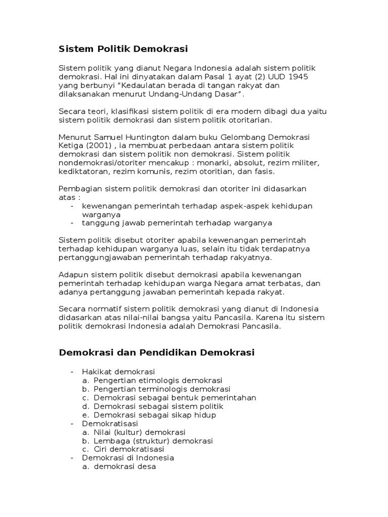 Sistem politik demokrasi dibedakan menjadi tiga macam yaitu. Berdasarkan titik perhatiannya sistem politik demokrasi dibedakan menjadi tiga macam yaitu demokrasi formal demokrasi material dan demokrasi gabungan. Berdasarkan titik perhatiannya sistem politik demokrasi dibedakan menjadi tiga macam yaitu demokrasi formal demokrasi material dan demokrasi gabungan. Demokrasi sebagai sistem politik dan pemerintahan dianggap mempunyai akar sejarah yang panjang sampai kepada jaman yunani kuno sehingga ia tahan bantingan jaman dan dapat menjamin terselenggaranya suatu lingkungan politik yang stabil. Demokrasi langsung direct democracy yaitu suatu sistem politik yang memberikan hak kepada rakyat secara langsung untuk ikut serta melakukan kegiatan kegiatan.